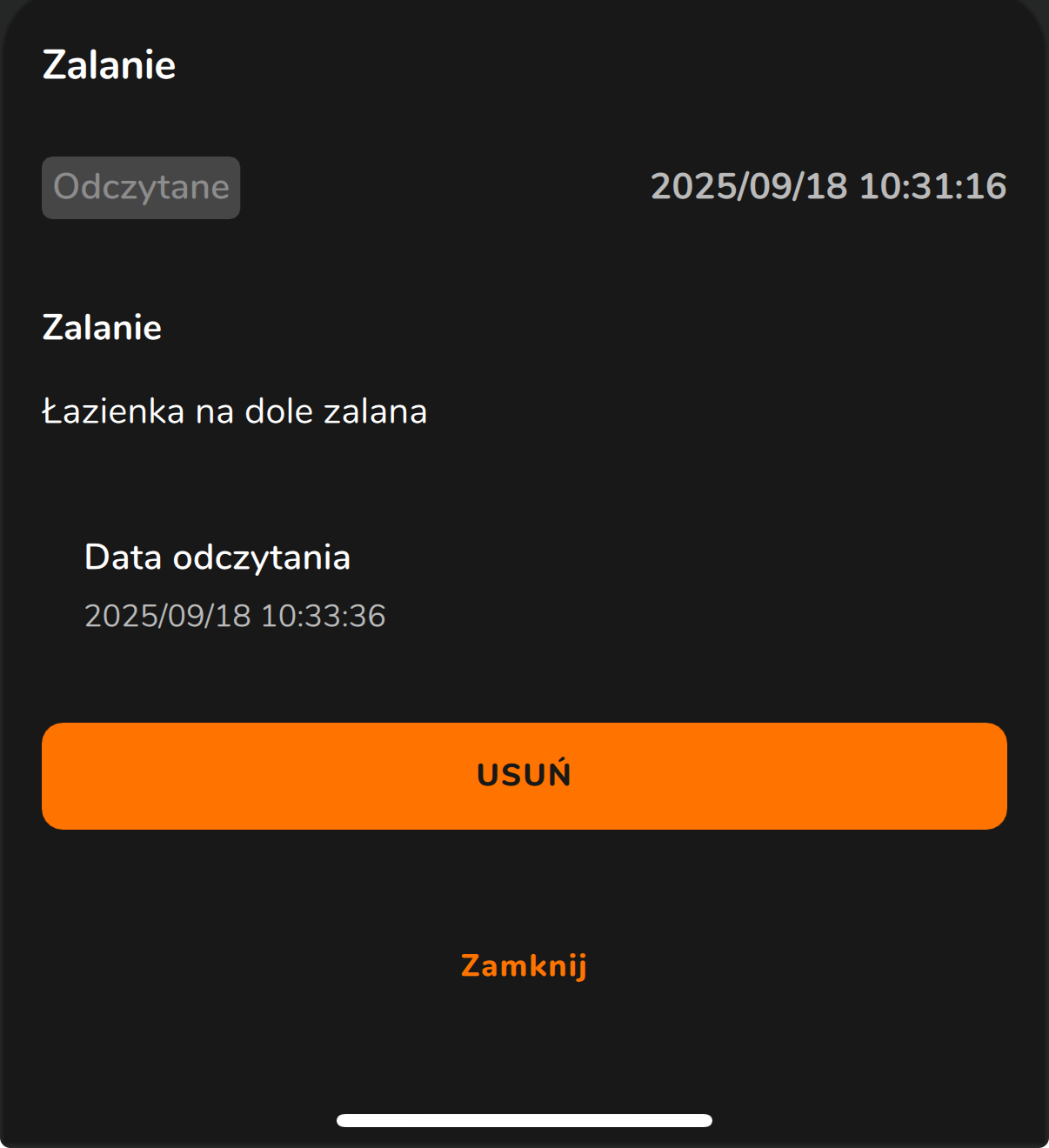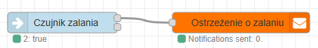 Bloczek output przesyła fizyczny stan czujnika zalania umieszczonego w łazience. Jeżeli czujnik wykryje wodę zmieni swój stan na true i zostanie wysłane powiadomienie o zalaniu.