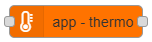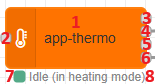 Na wejściu bloczka mamy wartość z zewnętrznego czujnika temperatury oznaczoną za pomocą bloczka tag:2 oraz wartość zadaną w bloczku przypisaną na wypadek restartu systemu oznaczoną tag:1. Bloczek app-thermo ustawiony zarówno w konfiguratorze, jak i aplikacji mobilnej Fox w tryb automatyczny. W zależności od wartości pobieranch wejściu bloczek aktywuje odpowiednie wyjście. W przedstawionym przykładzie bloczek aktywował wyjście „chłodzenie” chcąc dorównać wartość zmierzoną z czujnika (tag:2) do wartości zadanej (tag:1).