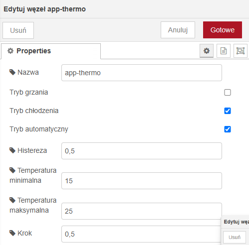 Zaznaczenie dowolnego trybu w konfiguratorze odblokowuje możliwość jego wybrania w aplikacji mobilnej Fox. Aby wyjścia grzanie/chłodzenie wystawiły wartość true użytkownik musi włączyć odpowiedni tryb w aplikacji mobilnej Fox