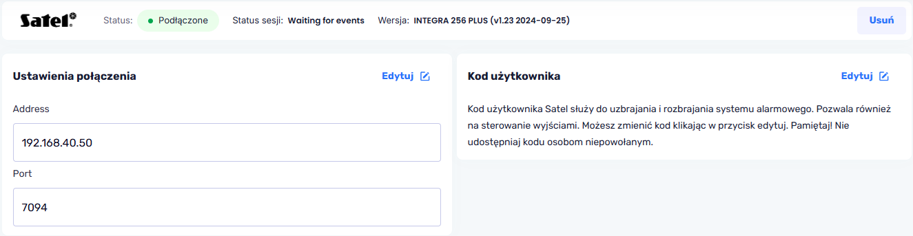 Podczas konfiguracja możemy wpisać kod dowolnego użytkownika skonfigurowanego w centrali Satel. Należy jednak pamiętać, iż podany użytkownik musi posiadać uprawnienia do uzbrojenia/rozbrojenia alarmu.