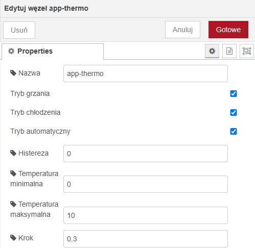 Zaznaczenie dowolnego trybu w konfiguratorze odblokowuje możliwość jego wybrania w aplikacji mobilnej Fox. Aby wyjścia grzanie/chłodzenie wystawiły wartość true użytkownik musi włączyć odpowiedni tryb w aplikacji mobilnej Fox