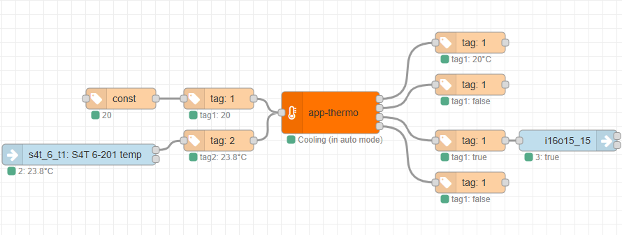 Na wejściu bloczka mamy wartość z zewnętrznego czujnika temperatury oznaczoną za pomocą bloczka tag:2 oraz wartość zadaną w bloczku przypisaną na wypadek restartu systemu oznaczoną tag:1. Bloczek app-thermo ustawiony zarówno w konfiguratorze, jak i aplikacji mobilnej Fox w tryb automatyczny. W zależności od wartości pobieranch wejściu bloczek aktywuje odpowiednie wyjście. W przedstawionym przykładzie bloczek aktywował wyjście „chłodzenie” chcąc dorównać wartość zmierzoną z czujnika (tag:2) do wartości zadanej (tag:1).