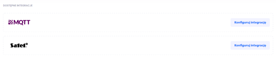 Strona umożliwiająca zarządzanie integracją systemu z urządzeniami poprzez protokół komunikacyjny mqtt oraz systemami alarmowymi satel.