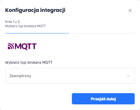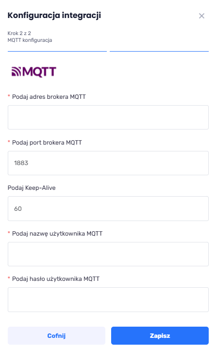 Po wybraniu brokera zewnętrznego należy uzupełnić pola z gwiazdką, aby skonfigurować integrację. Wymagane informacje: * adres brokera MQTT * port brokera MQTT * nazwa użytkownika mqtt * hasło mqtt