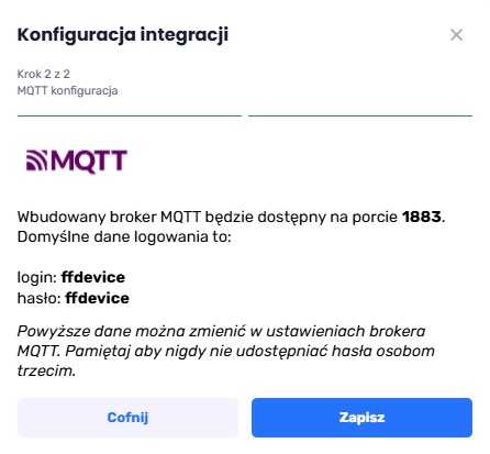Po wybraniu wewnętrznego brokera użytkownik dostaje adres portu oraz domyślny login i hasło. W urządzeniu należy dodac adres serwera.