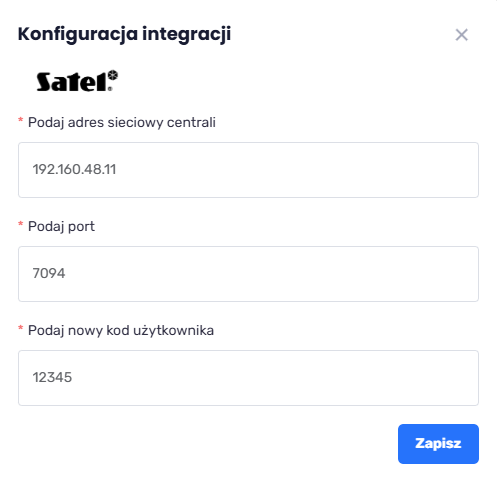 Podczas konfiguracja możemy wpisać kod dowolnego użytkownika skonfigurowanego w centrali Satel. Należy jednak pamiętać, iż podany użytkownik musi posiadać uprawnienia do uzbrojenia/rozbrojenia alarmu.